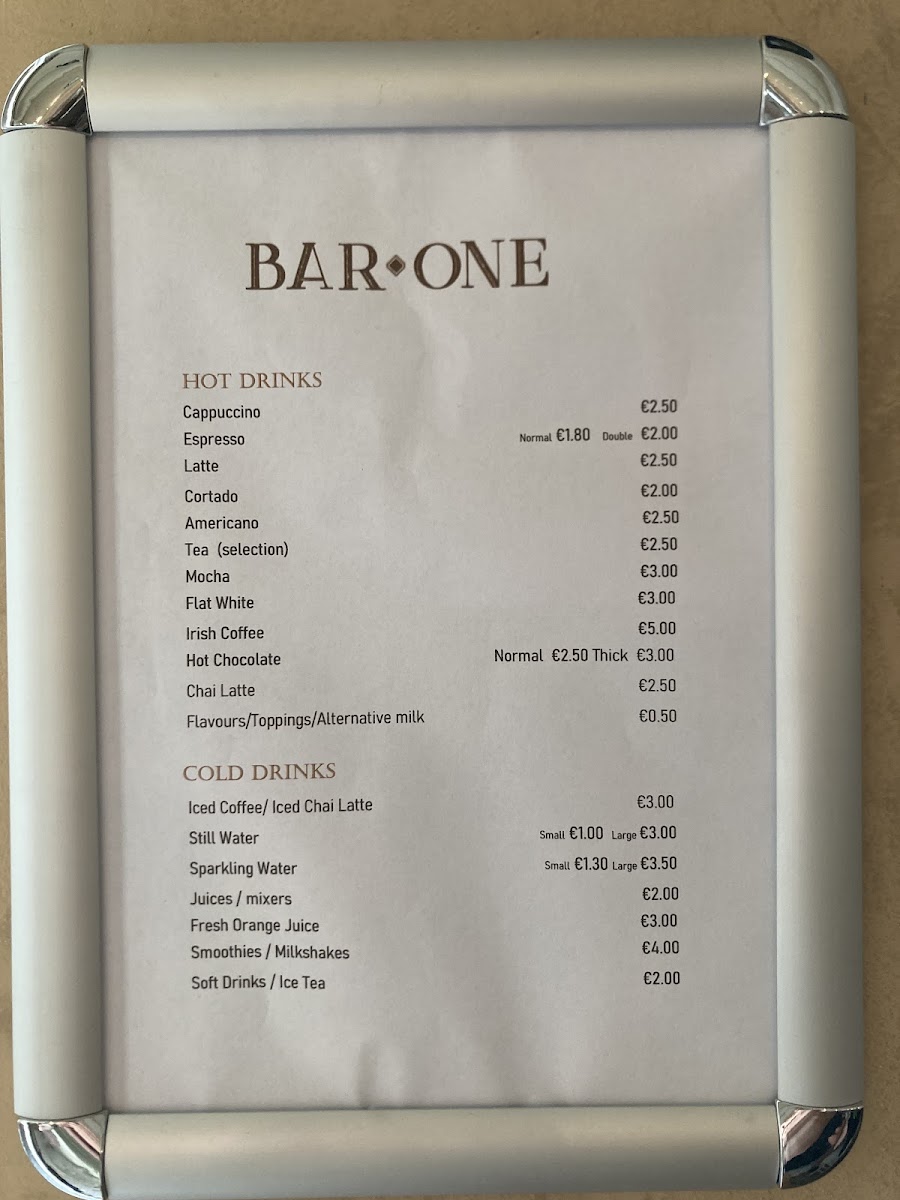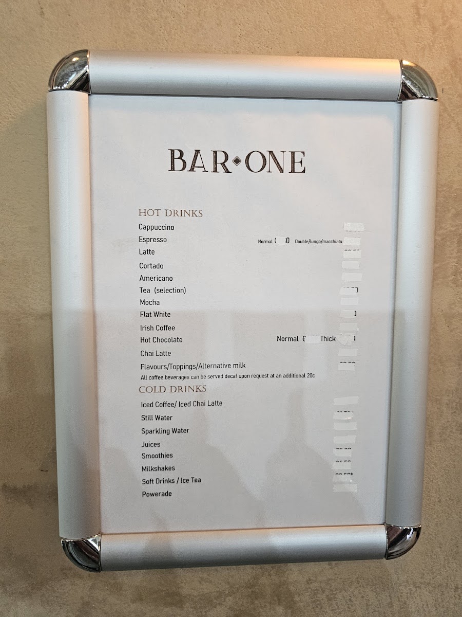 Bar One Cafe Menu
